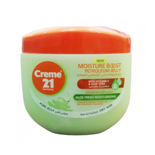 كيف تستعمل: ابدأ ببشرة نظيفة وجافة. يمكنك غسل بشرتك بمنظف لطيف وتجفيفها بالتربيت عليها قبل وضع الفازلين Creme 21. خذ كمية صغيرة من Creme 21 Aloe Fresh Moisturizing Petroleum Jelly للبشرة الجافة على أطراف أصابعك وضعها على المنطقة المصابة. قم بتدليك الجيلي بلطف على بشرتك بحركات دائرية. انتبهي أكثر للمناطق الجافة بشكل خاص، مثل المرفقين والركبتين والكعبين. اسمح للهلام بأن يمتصه جلدك. يمكنك تركه طوال الليل أو أثناء النهار، كما تفضلين. أعد وضع الهلام حسب الحاجة طوال اليوم للحفاظ على الترطيب وتخفيف الجفاف.
